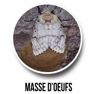 La spongieuse fait partie de l'ordre des Lépidoptères et n’a qu’une génération par année, laquelle inclue quatre stades de développement : œuf, larve, chrysalide (nymphe) et adulte. Les œufs de la spongieuse sont pondus fin juillet ou début août. Les œufs sont généralement pondus dans des zones sombres et abritées comme dans les crevasses de l'écorce, sur la face inférieure des branches, ou dans la litière de feuilles, bien qu'ils puissent également être trouvés sur une grande variété de surfaces telles que les roches, les bâtiments, les meubles de jardin et les automobiles. Les œufs sont recouverts de fins poils bruns provenant de l'abdomen de la femelle, donnant à la masse d'œuf l'apparence d'un petit morceau de chamois. Les masses d'œufs peuvent varier en taille et contenir de 100 à 1000 œufs.