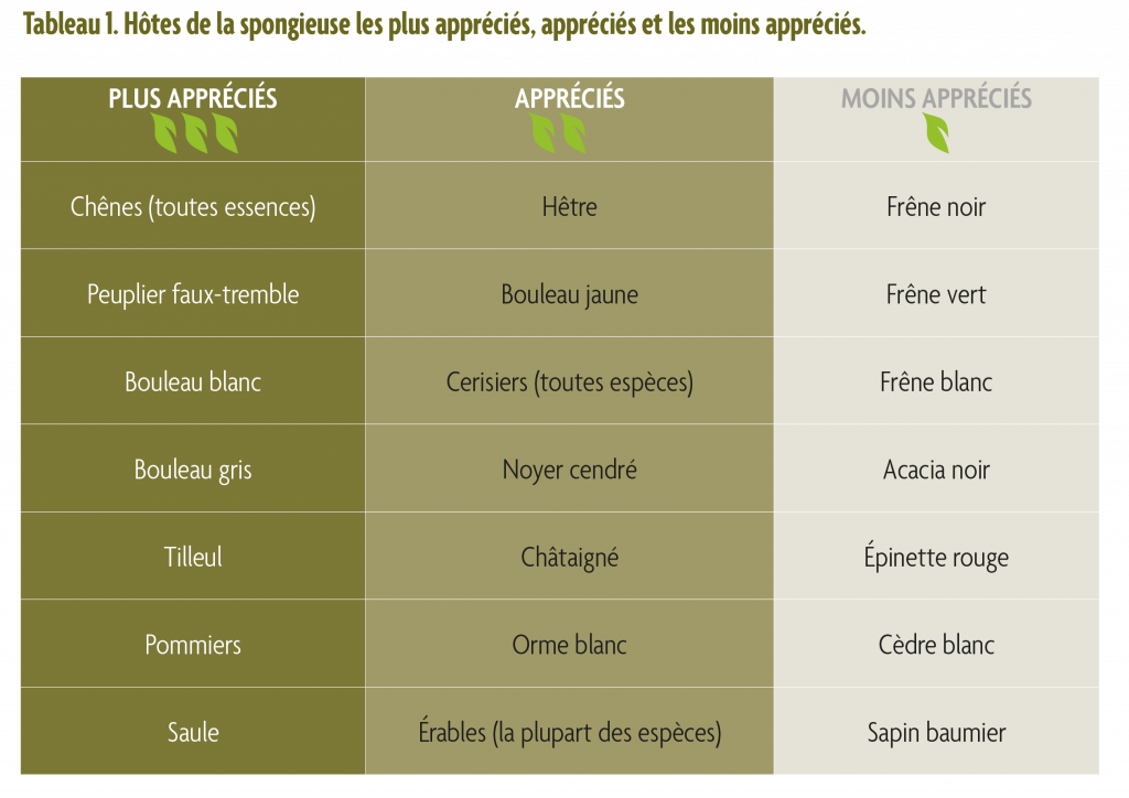 La spongieuse peut être trouvée sur plus de 100 espèces d'arbres différentes et est un important défoliateur des arbres forestiers, ornementaux et des vergers. Ce ravageur défolie principalement les feuillus mais aussi certains conifères. Le tableau 1 répertorie les espèces d’hôtes les plus courantes de la spongieuse, lesquelles sont classés par niveau de préférence. Pendant son développement, une larve est capable de consommer en moyenne 1 m2 de feuillage, ce qui est à peu près l’équivalent de 10 à 15 feuilles entières. Ce sont les larves du dernier stade larvaire qui provoquent la plus sévère défoliation, lesquelles sont responsable de la consommation des trois quarts de la quantité totale de feuillage. Une infestation de spongieuse peut affecter une zone de plusieurs façons. Généralement, la perte de feuilles devient perceptible lorsqu'un arbre présente de 30 à 40% défoliation. À long terme, une infestation de spongieuse peut causer la mort de branche et, à un certain niveau, de l'arbre en entier. Plusieurs facteurs influent sur la façon dont un arbre réagit à la défoliation de la spongieuse, notamment la quantité de feuillage, les conditions météorologiques, le nombre d'années de défoliation répétée, le moment de la défoliation au cours la saison de croissance, ainsi que la santé et la vigueur de l'arbre au moment de la défoliation. La plupart des arbres sains peuvent supporter une seule année de défoliation modérée à sévère, mais deux à trois années de forte défoliation (≥ 50 %) peut entraîner la mort de branches ou même d'arbres entiers.